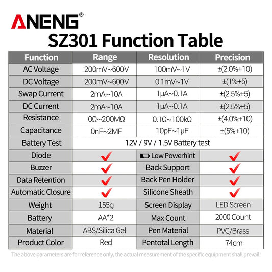Aneng SZ301 Digital Multimeter AC/DC Votage Current Automatic Tester Electrical Resistance Ohm Ammeter Capacitance Meter