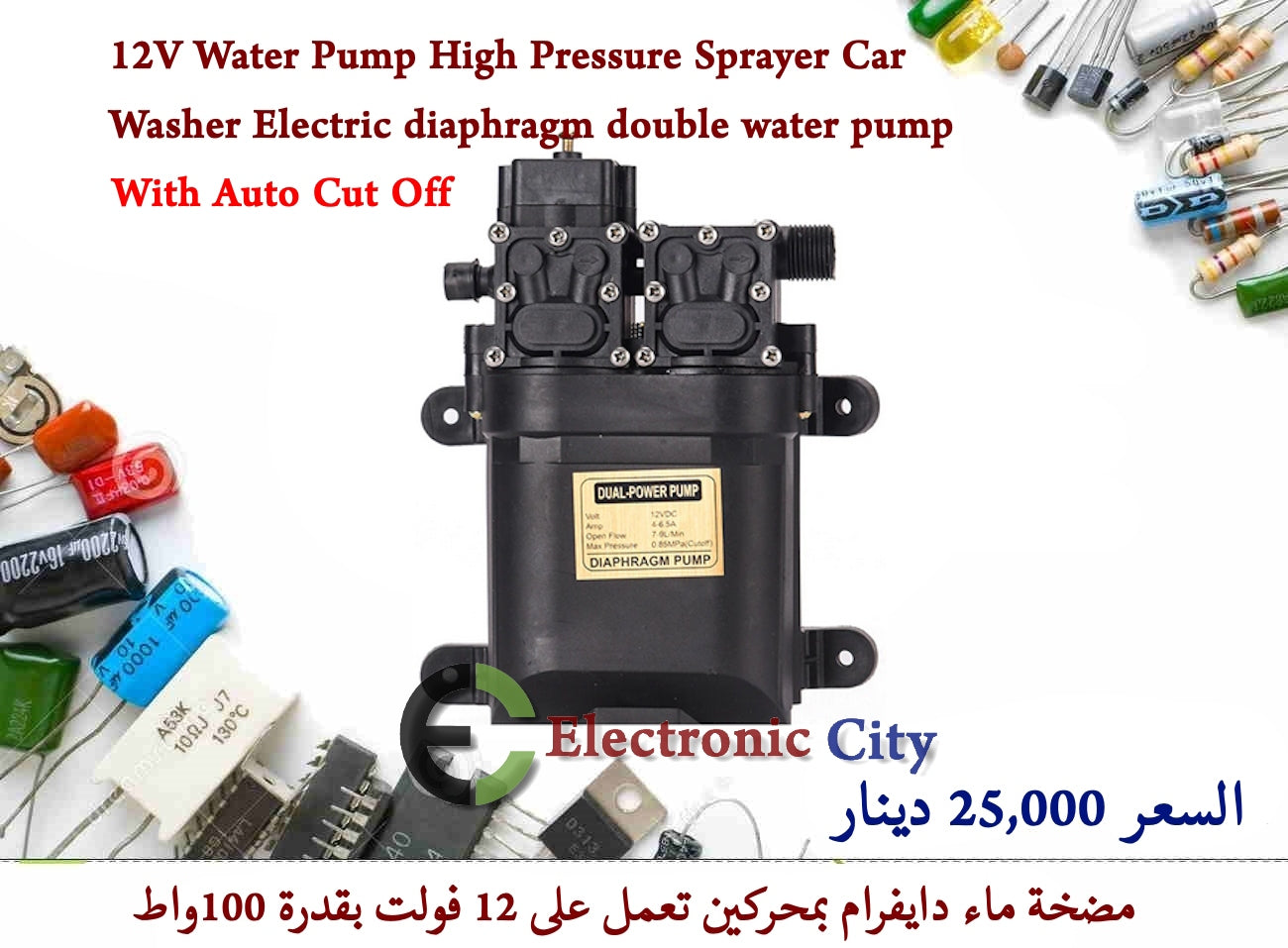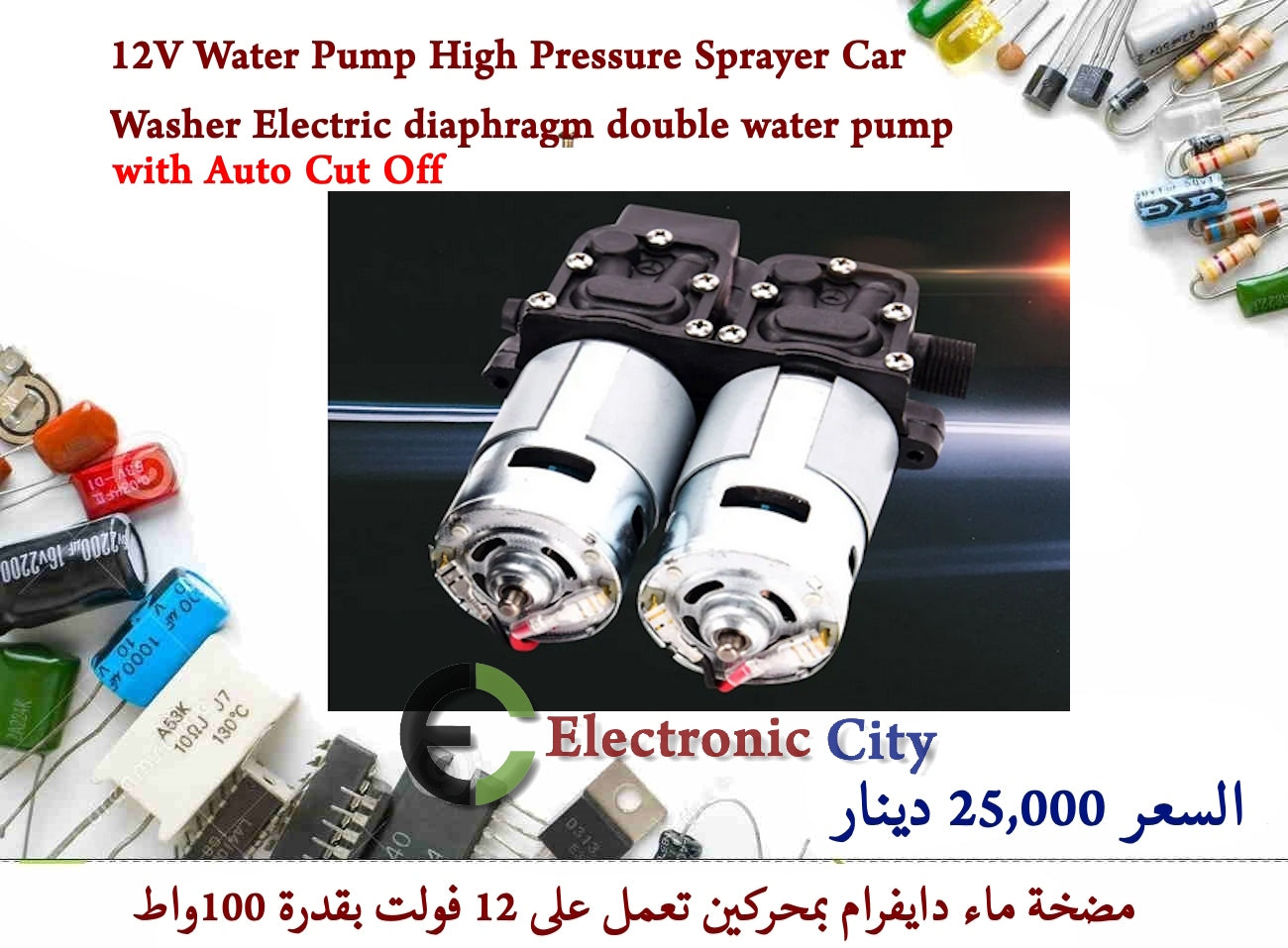 مضخة ماء تعمل على جهد 12 فولت مزودة بمحركين مما يتنج ضغط ماء عالي