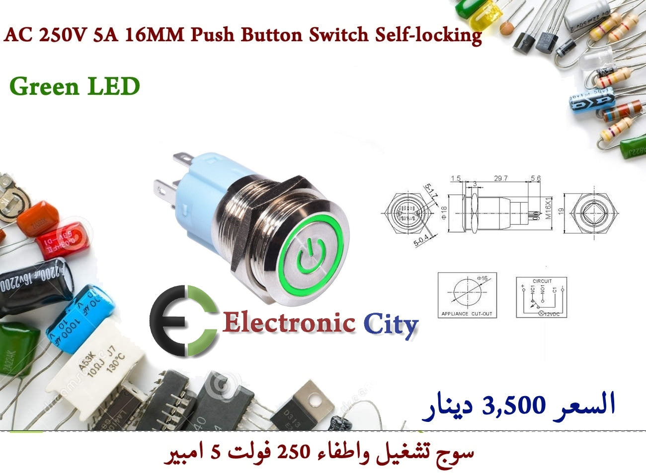 AC 250V 5A 16MM Push Button Switch Self-locking Green #B7 X52466
