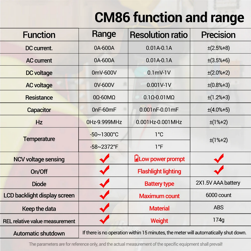 1.Fully functional: 600a ac/dc automatic range clamp meter, 6000 counts for 15 minutes without operation and automatically shuts down.